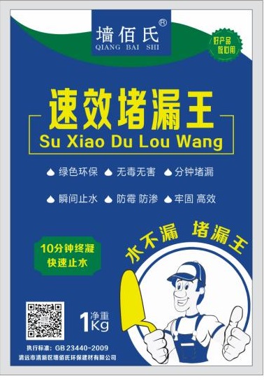 速 效 堵 漏 王 一、產品特性1、硬化快,初凝時間1—3min,終凝時間4—7min。3至6min內即可堵住一定壓力的滲漏。2、粘結力強,對混凝土、鑄鐵管、陶瓷等都有較強的粘結力。3、微膨脹、抗滲漏、抗腐蝕,既可堵漏又能防水。而且持久耐用。4、安全環保,對人體無任何危害。二、適用范圍...